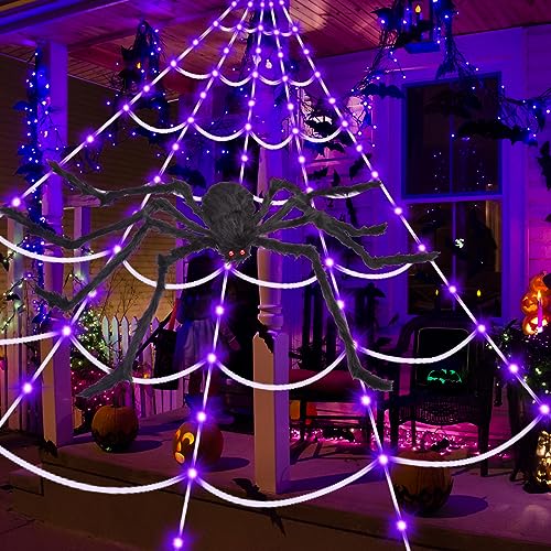 OCATO Halloween Decorations Spider Webs: Halloween Spider Web Lights 135 LED Purple Lights 59" Giant Spider Scary Halloween Decorations Outdoor Indoor for Party Garden Home Costumes Yard Haunted House